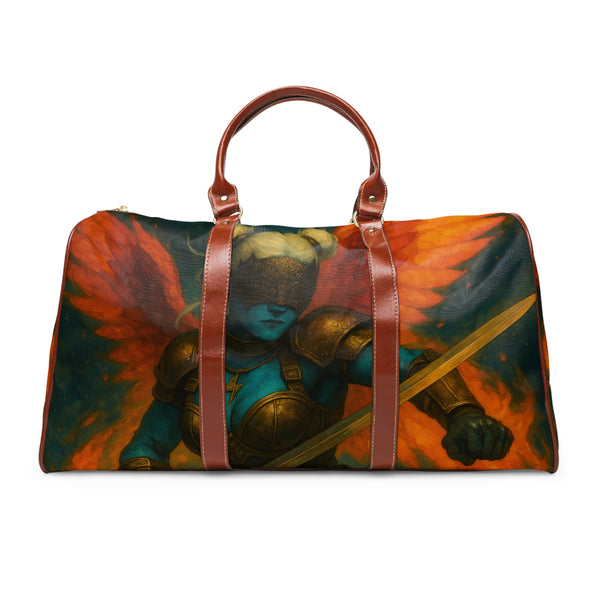 A blindfolded warrior with blazing wings and a drawn blade commands the full surface of this all-over print duffel. Strength restrained. Power contained. Reckoning imminent. This is not passive design — this is movement with intention.