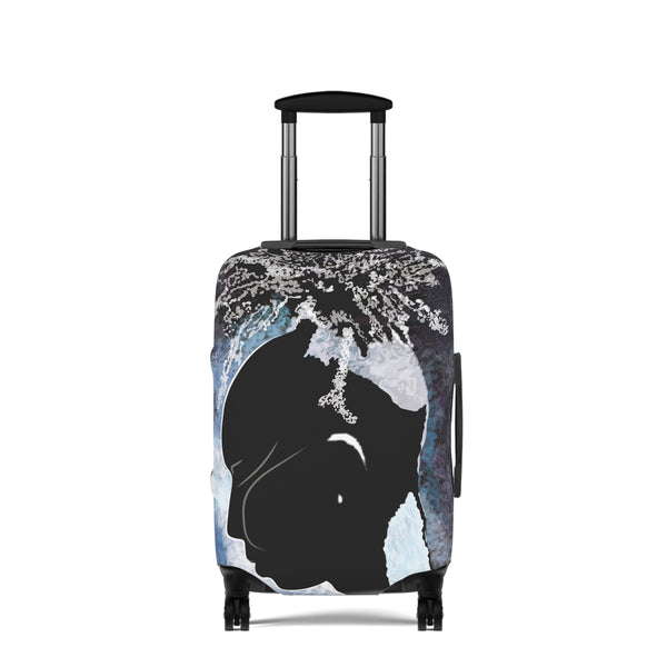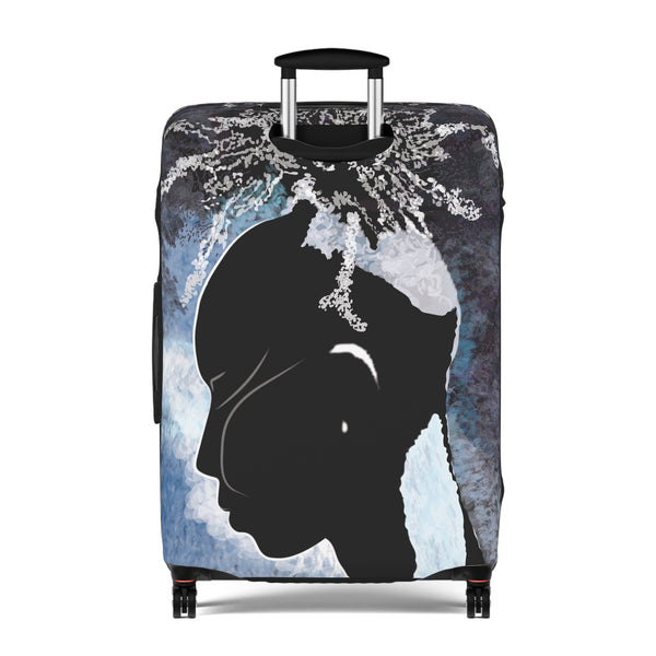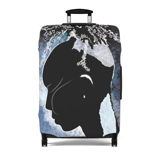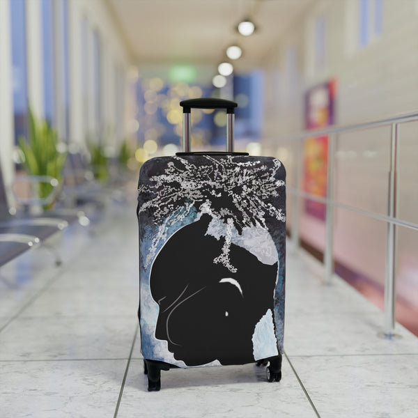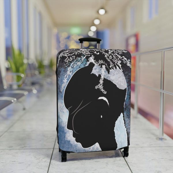 The Dreaded Splendor™ Stretch Luggage Cover from Ribbie’s Creations™ features a powerful afro silhouette crowned in textured dread detail, framed by cool tonal blues and shadowed contrast. This design honors natural hair, ancestral strength, and the quiet confidence of moving through the world on your own terms.