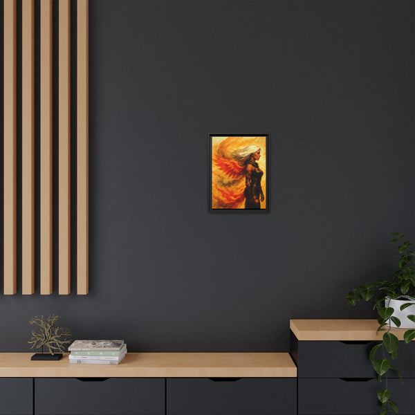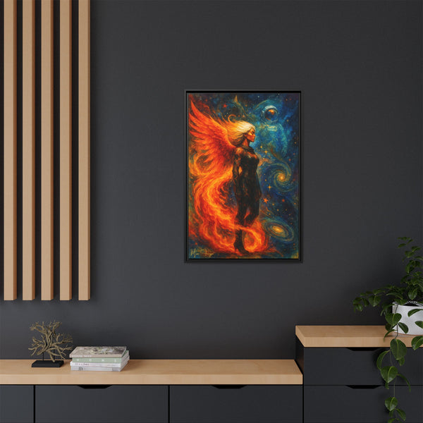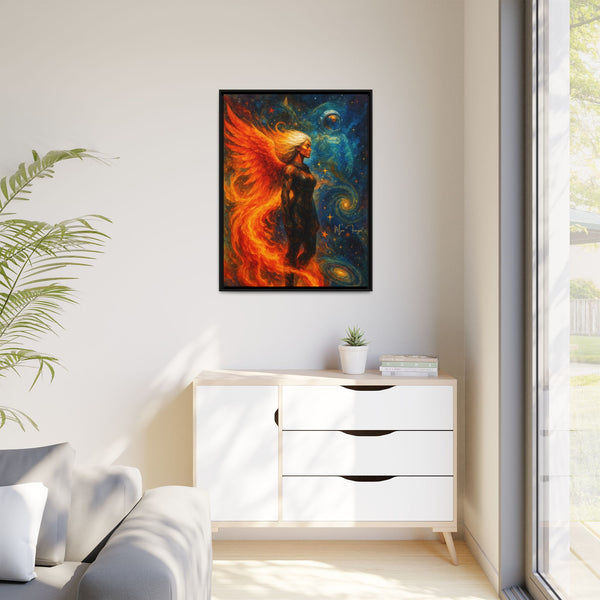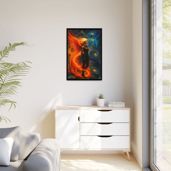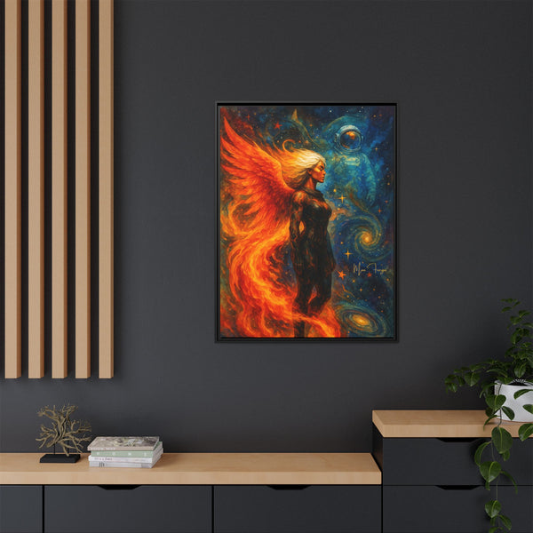 Printed on FSC-certified matte canvas with non-toxic inks, every detail holds: the depth in the blues and golds behind him, the shifting flames around her wings, and the texture of armor and hair. The piece maintains presence without overwhelming a room, making it suitable for studios, offices, creative spaces, or interiors that lean atmospheric and modern.