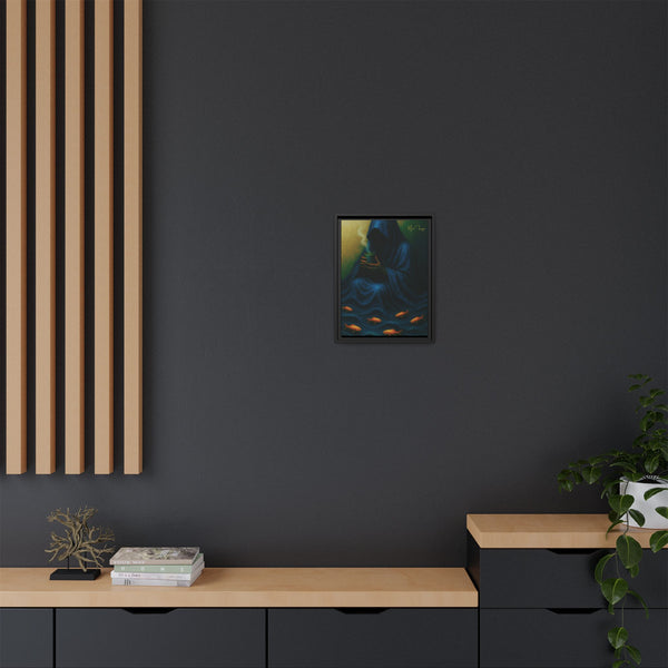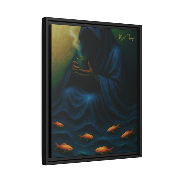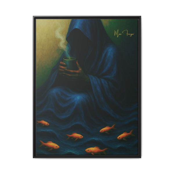 Stormtide Serpentine wall art | hooded figure artwork | cosmic noir canvas | deep blue abstract art | tidal cloak illustration | quiet danger artwork | serene but dark art | faceless hooded figure | blue wave aesthetic | goldfish surreal art | oceanic noir canvas | framed matte canvas | limited gold signature art | Beverly Hills Edition print | Max Fuega universe | Buy Martian Merch | aquatic shadow art | calm yet dangerous art | surreal tide artwork | hooded woman art print | high-definition canvas | FSC-certified canvas | modern sci-fi decor | cosmic feminine art | tidal current illustration