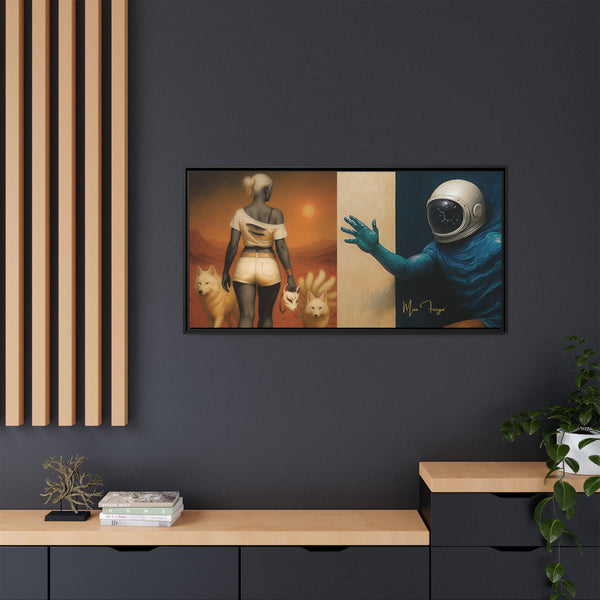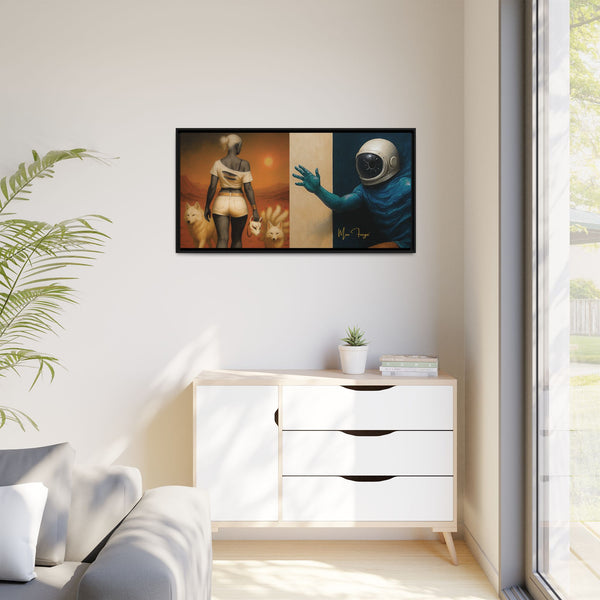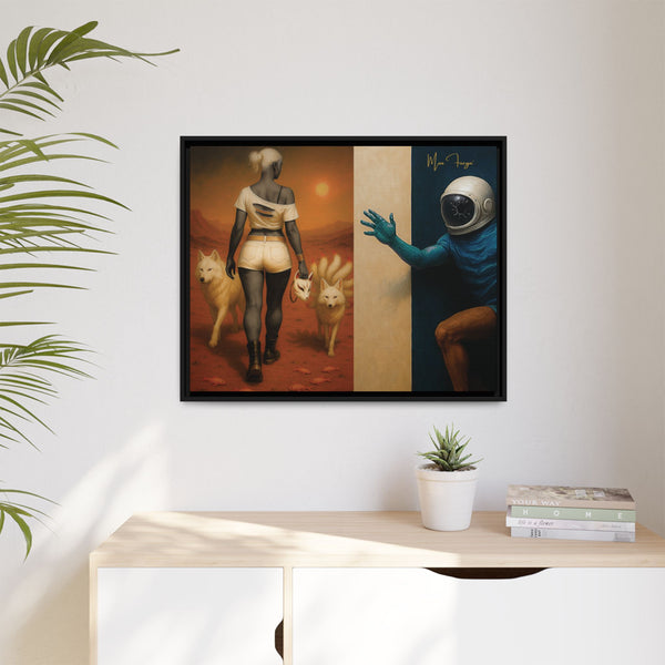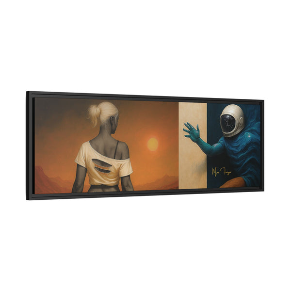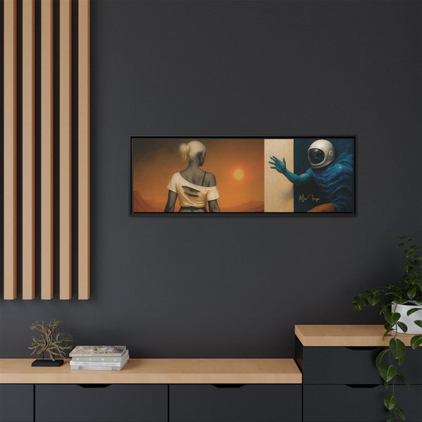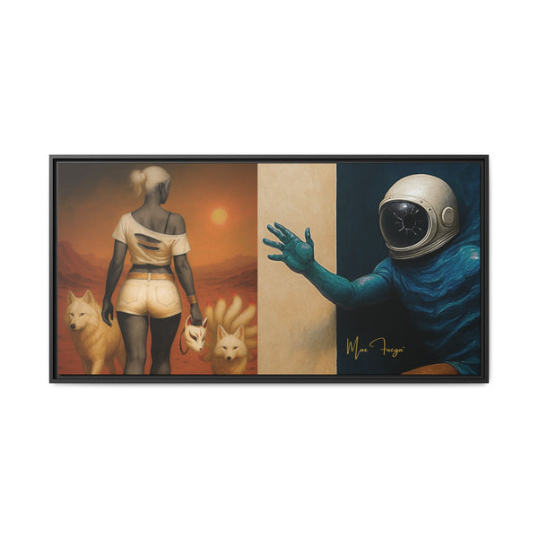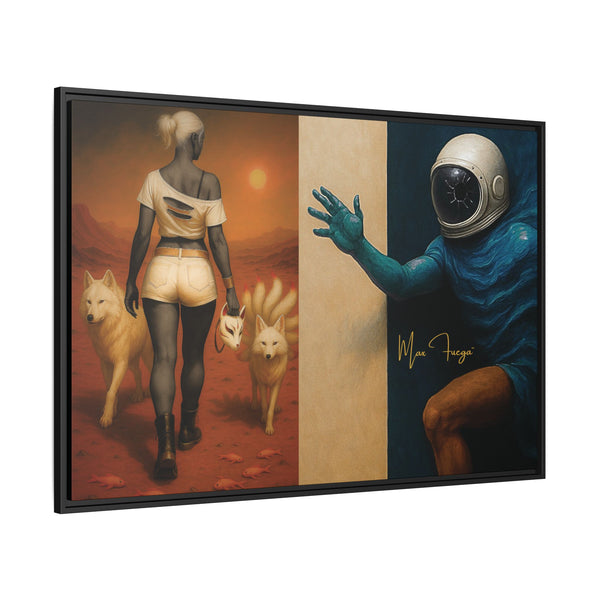 cosmic noir art, surreal duality canvas, Max Fuega signature art, 54 Mondays Beverly Hills Edition, AstroHollow artwork, LaReina art, dimensional distortion art, psychological diptych, surreal framed matte canvas, cosmic tension wall decor