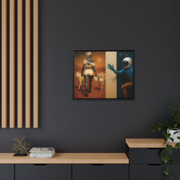 LaReina walks the Martian terrain with deliberate calm. Wolf of protection to her left; nine-tail fox on her right — both coy and aware. Kitsune mask hanging loosely from her hand. A walking declaration of distance, AstroHollow reaches toward her from the fractured dimension he’s trapped within, but his hand never makes contact. Outstretched...but just out of reach.